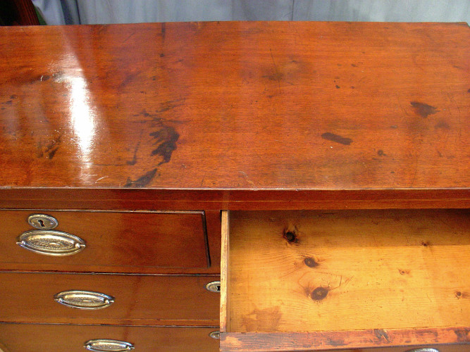 This is a quite charming mahogany chest of drawers, has a lovely well used feel and pattina, good small size, attractive colour, top and drawers are edged with ebany stringing, pine linned.