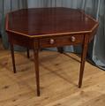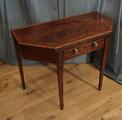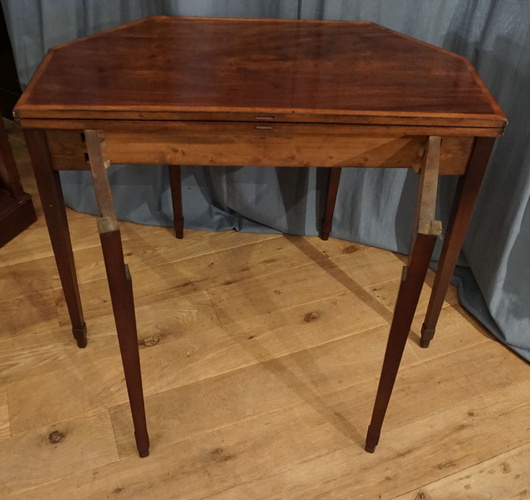 Superb quality mahogany tea table inlaid with satinwood banding and boxwood lining, made in the late 18th century very high quality construction unusual double action rear legs folding out to take the foldover top, drawer with original lock and key.