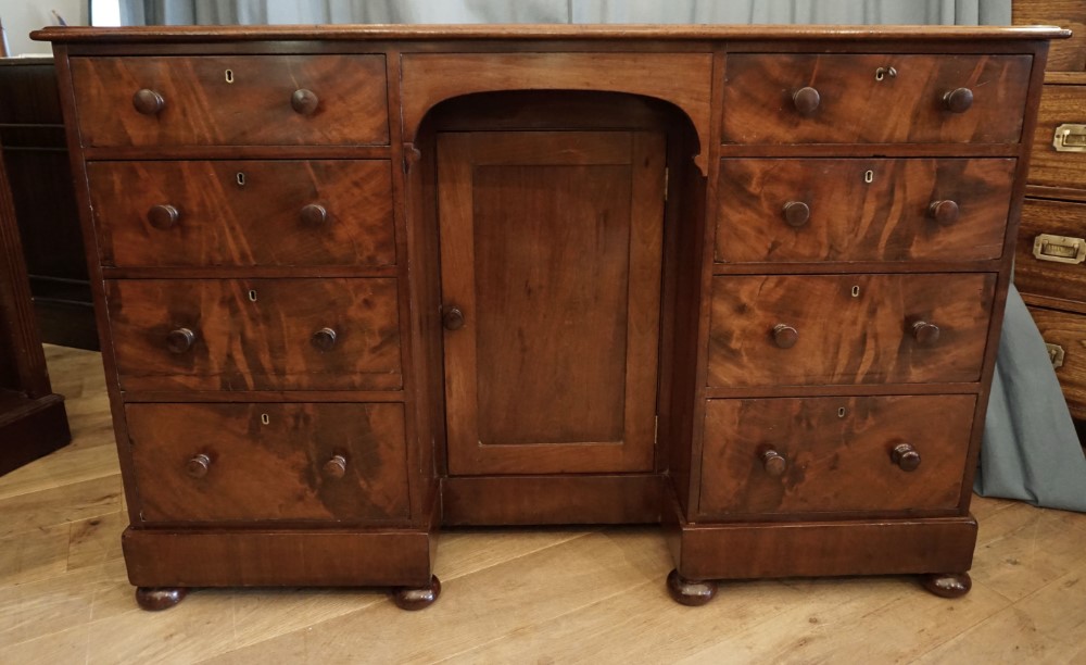 Fantastic quality mahogany knnehole desk, 19th century, ceder lined drawers, stamped makers name "Clear manufacturer of Wolverhampton", cupboard in the centre kneehole, all locks functioning, original turned knobs, new tooled leather, lovely curl venner drawer fronts.
