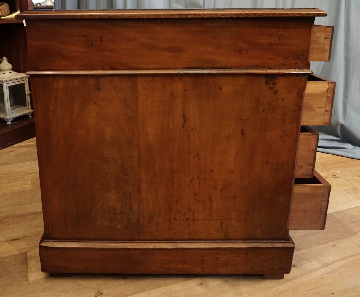 Lovely Arts and crafts period (1890) pedestal desk from the Gothic Revival series piece in mahogany, nice mellowed out colour, green leather ledger, lovely mahogany linned drawers with bevelled rails and distinctive gothic style drop handles, breaks down in three parts.