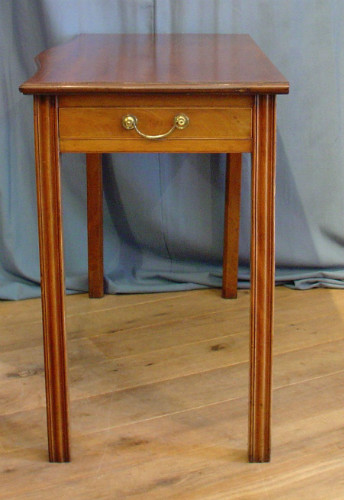 This is a solid mahogany sidetable or small writting table of the finest quality, serpentine fronted lovely Prince of Wales feathers inlays on the front rail, top also has boxwood stringing inlay, small drawer wth a gilded handle in the end which is unusual, piece dates back to the early 1800's.