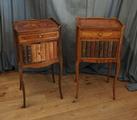 Here we have a slightly un matched pair of kingwood French bedside tables, with the rather attractive book bands on the two concealed doors under the drawer, thes two are vintage exact age is unknown, probably early 20th century.