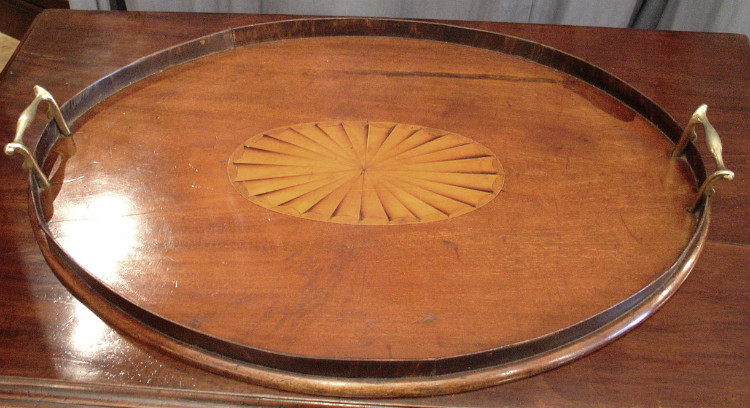 Here's a lovely 19th century mahogany tray with a very attractive fan inlay in the centre.