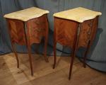 Here we have a nice pair of vintage french bedside tables each with three drawers, lovely kingwood veneers and a marble tops.