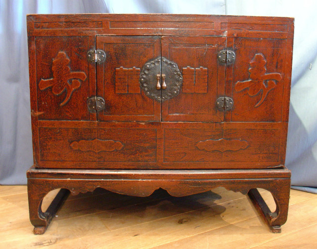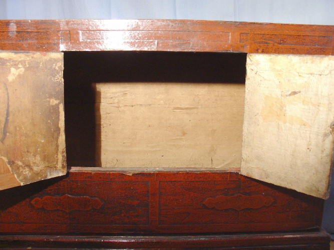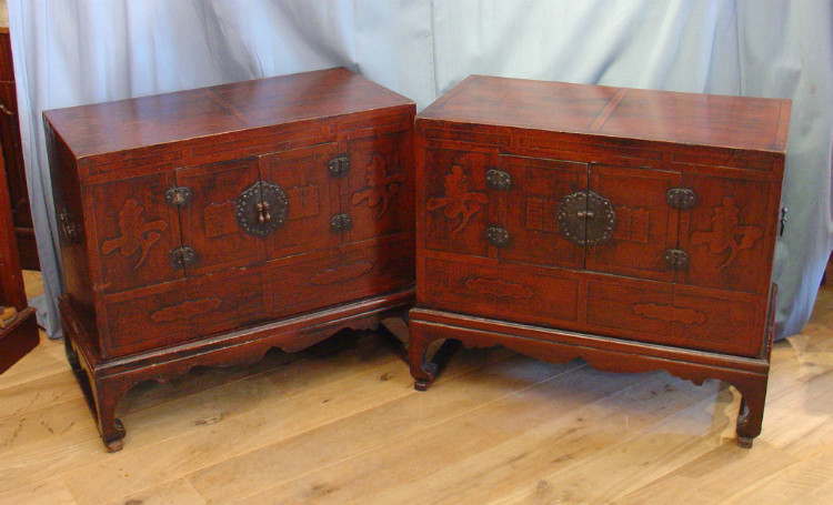 This is a pair of very decorative early 20th century brides chests on stands fro Korea, constructed from wood with papermache and laquer work.
