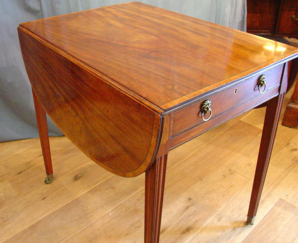 This is a quite exeptional Regency Pembroke table( early 19th century) in mahogany, inlaid with boxwood and ebany stringing and rosewood crossbanding, very origional pattina, French polished, origional Georgain castors, ivory keyhole escutcheons, double flap supports, on the second end it has a dummy drawer also with the familiar Lion head drops.