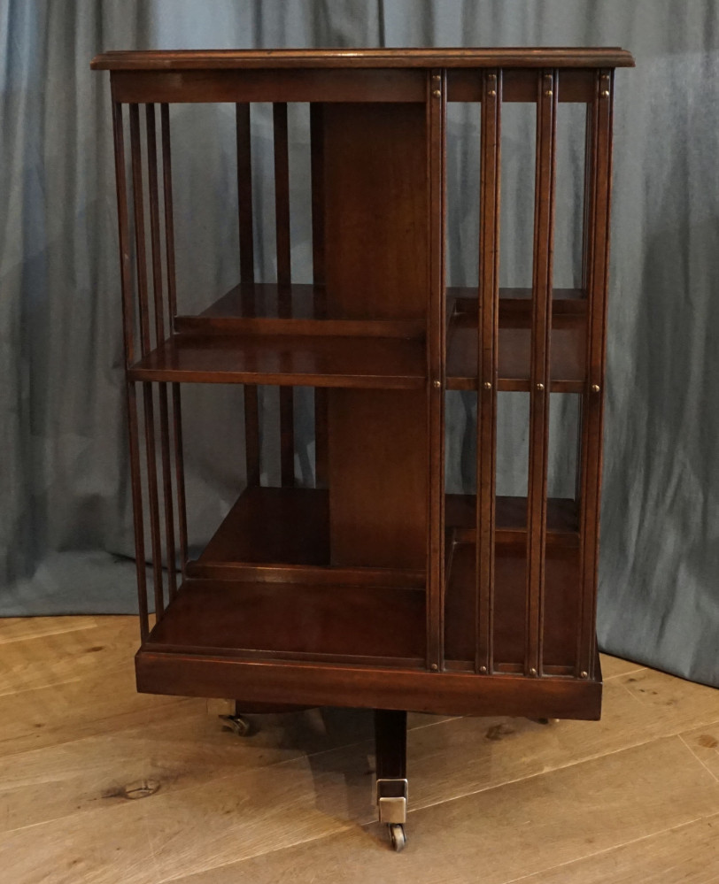 Lovely quality vintage revolving bookcase in mahogany with a red leather insert on the top and lovely brass box castors on the crrosfoot base.