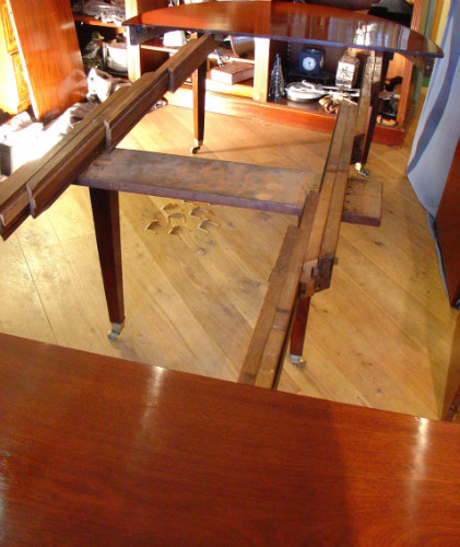 The construction is such that it is the ultimate in versatility being able to be small and round as well as extend to seat a large dinner party, and the legs are not at all intrusive having two centre legs set well towards the middle of the table.