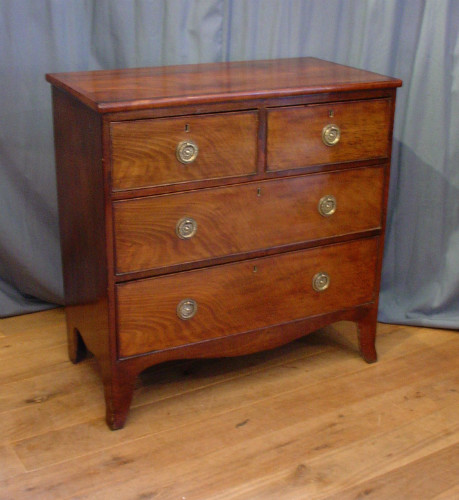 This is a small early 19th century chest of drawers in a very conveiniant size, drawers are oak lined with a lovely pattined mahogany fronts.