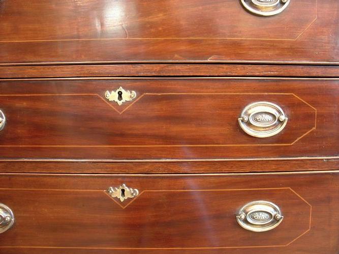 This is a very nice mahogany Georgian secretaire in a small size, from roughly 1790 I guess, it has boxwood inlays and a nice set of old handles, interior has those typical small drops on the drawers, all the drawers have oak linings, it is normal to pay a very high premium for a small Georgian chest not the case here though ! , and rare to find one with a nice origional secretaire in it.