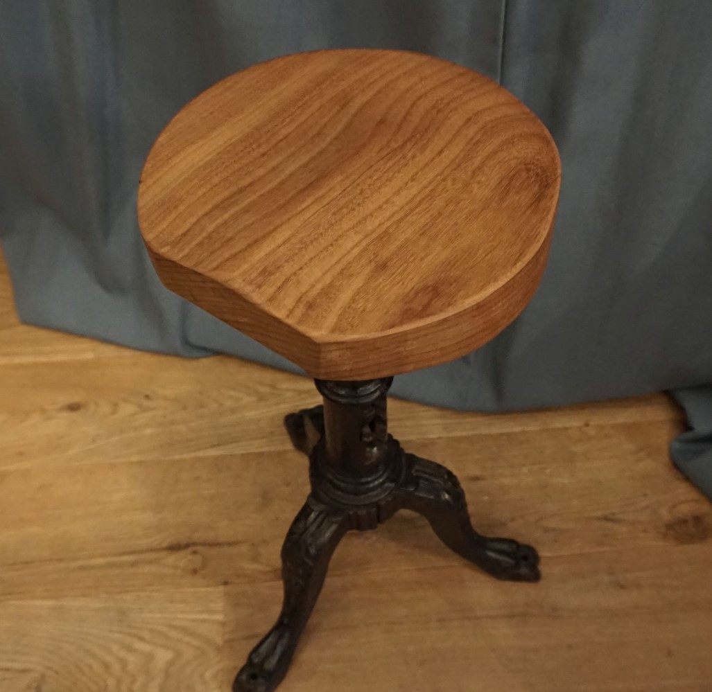 Unusual cast iron adjustable stool with shaped elm wood seat.size: