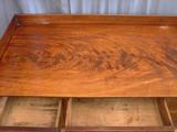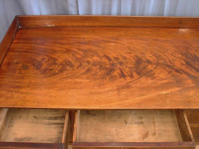 This is a completely origional writting table in mahogany dates from the middle of the 19th century, very unusually the top is made out of a solid spanish curl, this cut of timber is extremely expensive and is therefore genarally only used in veneer form .