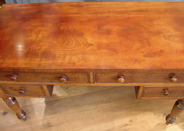 This is a mahogany writting table from around 1860, good origional condition, very solid , it has two drawers the lower two are dummy fronts for decoration, we have re-polished the top, leather inlay could be added if desired.
