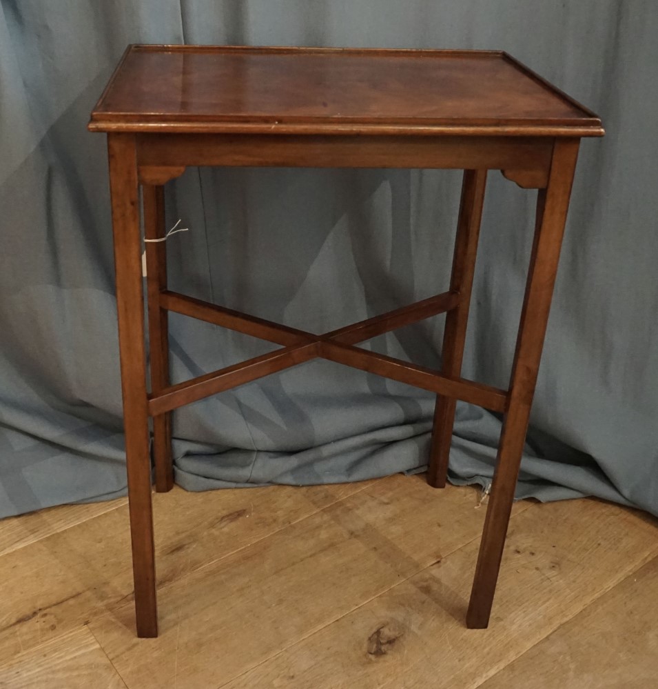 Lovely small rectagular table in mahogany with a curl top, size: 41cm x 28cm x 57cm high.