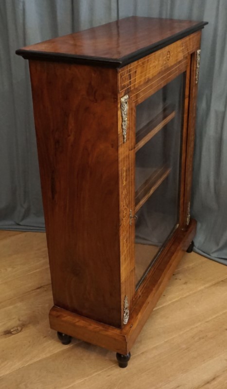 This is a lovely figured walnut peer cabinet with lovely inlays gilt ormalu decoration, and grey silk linned interior, completely original apart from the renewed linning, dates back to 1850, these were made as a copy of similar very expensive French pieces, in the day it was fashonable to lust after things French, and it still a popular style now.
