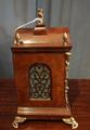 Small burr walnut table clock chimes the half hour, made in the 50's.