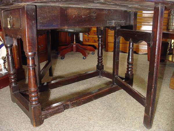 This is a very early period gateleg table in English oak ( 1690) has a plank top in quite dark patinered wax finish nicely shaped rails and with two draws one in each end , size 140cm x 110cm x 71cm.