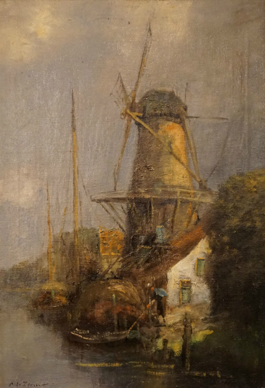 Here is a nice impressionistic work, river scene showing barges unloading next to a mill, beleived to be by A J Zwart, however the name is incomplete.size : 56cm x 71cm.