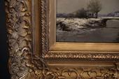 Lovely small winter landscape oil on wood panel 19th century, thought to be in the style or a copy of a work by Chattel van Frederic Jacobus 1856-1917, the name is partially removed, nice original work with original gilt frame.
