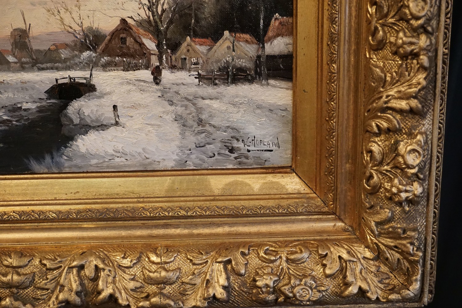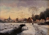 Lovely winter scene, showing a village in the snow with the sun setting. early 20th century signed J C Hofland.